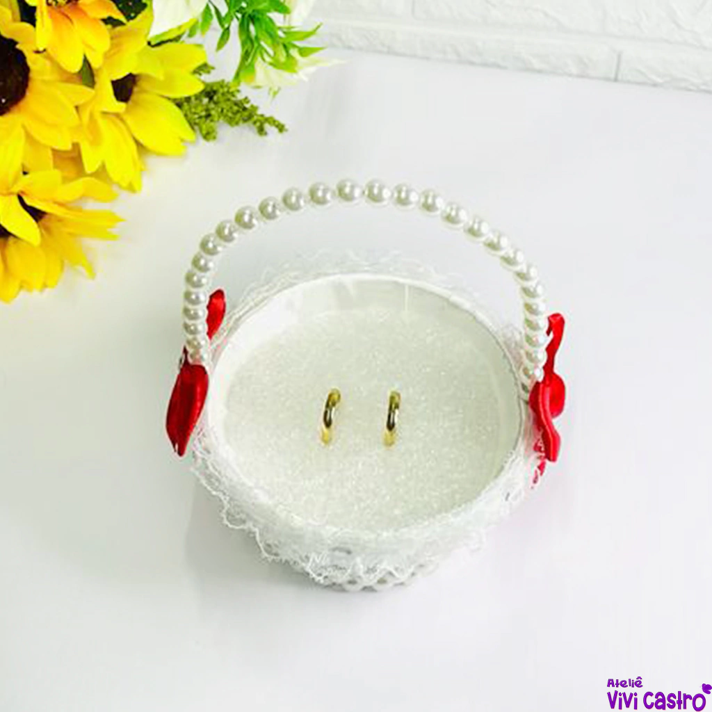 Cesta Daminha Renda Fru-Fru Pérola Porta Aliança Lacinho Vermelho
