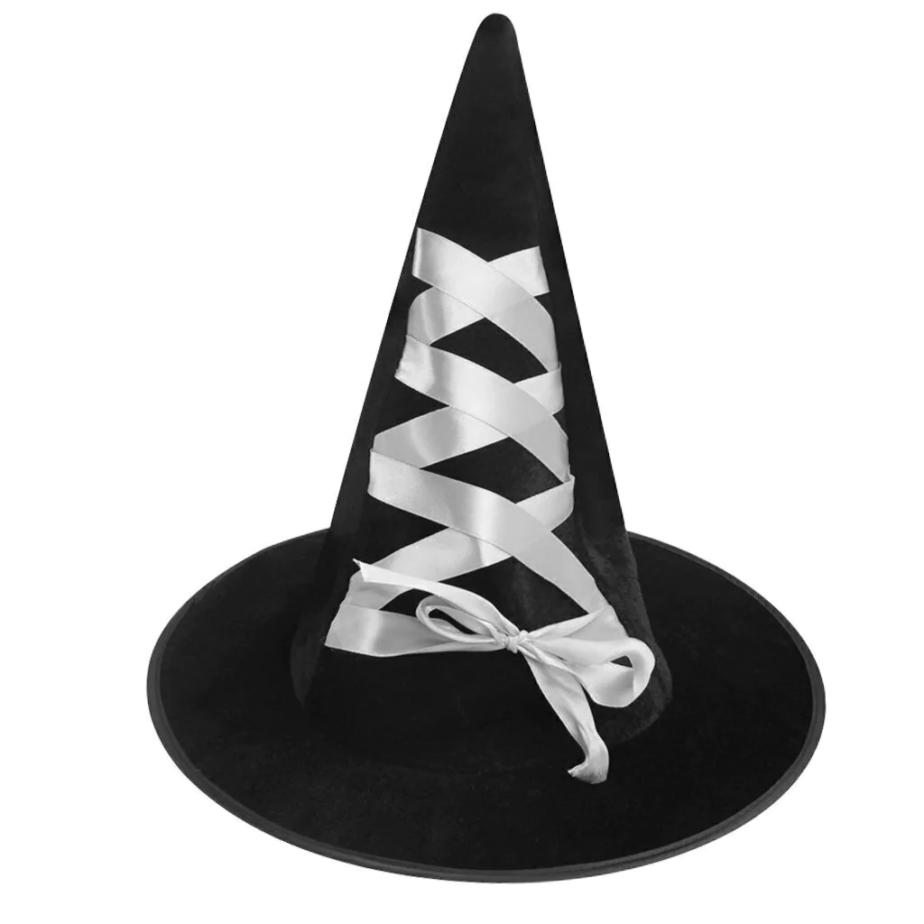 Chapéu de Bruxa feito de tecido aveludado preto, detalhes em fita de cetim, um toque de elegância.